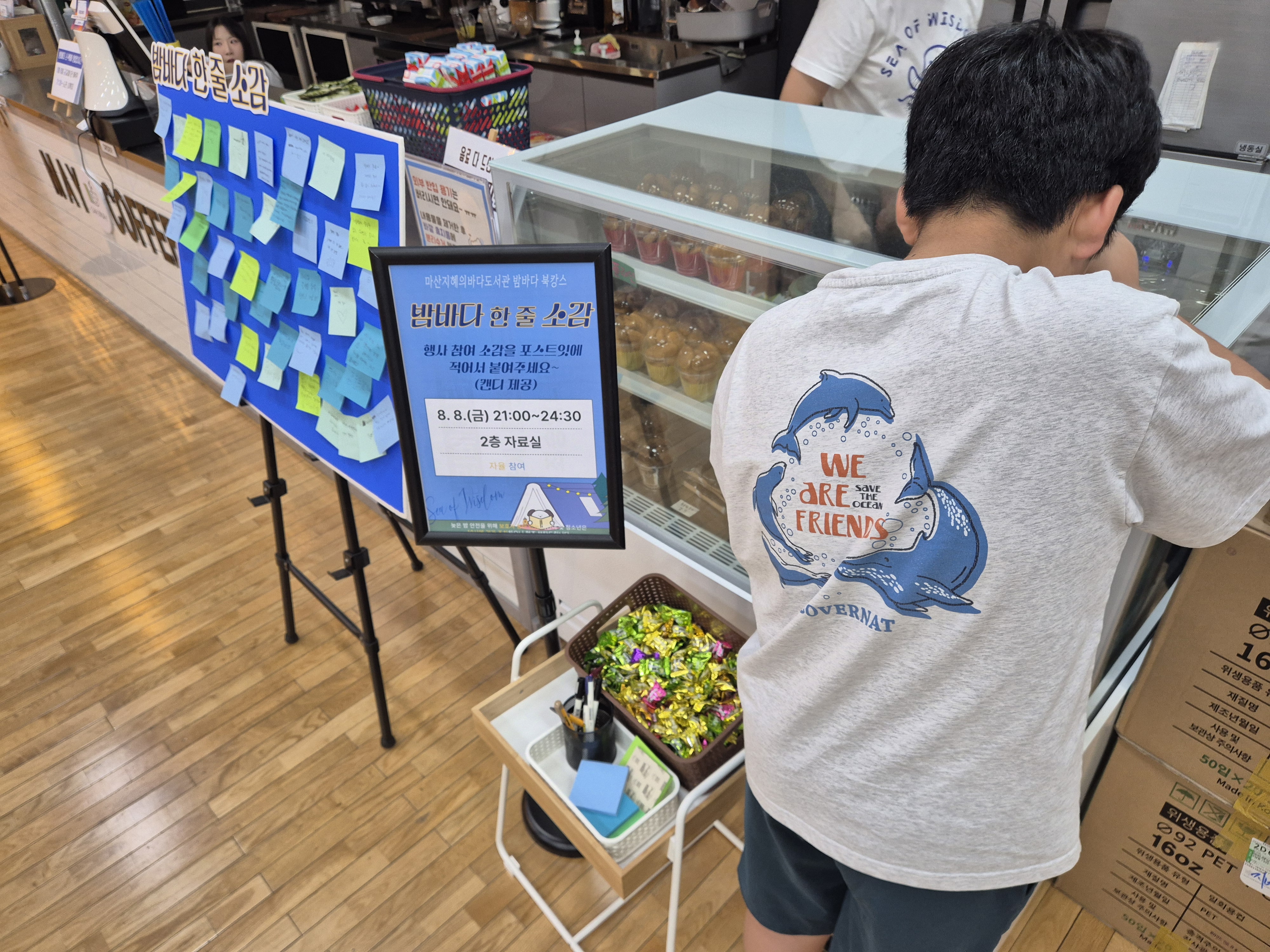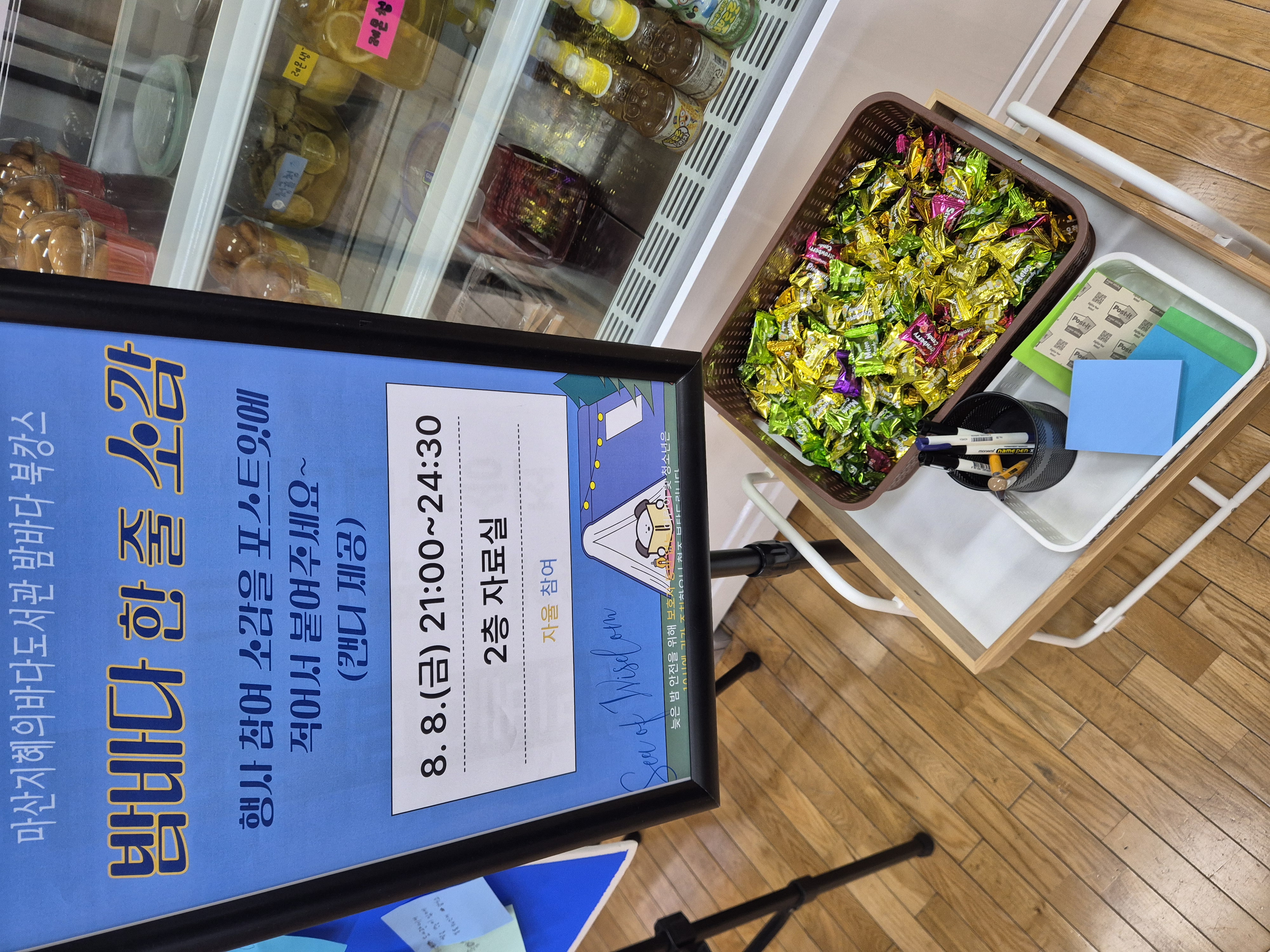 <밤바다 북캉스>에 참여 소감을 포스트잇에 적어 붙이면 사탕을 받을 수 있는 '밤바다 한 줄 소감'에도 참여했습니다.
