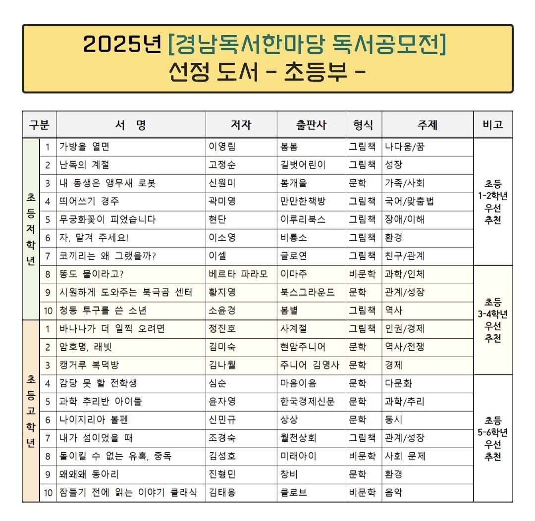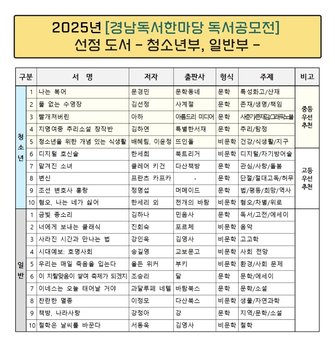 아래는 2025년 경남독서한마당 초등부, 청소년부, 일반부 선정도서입니다. 참고하세요!