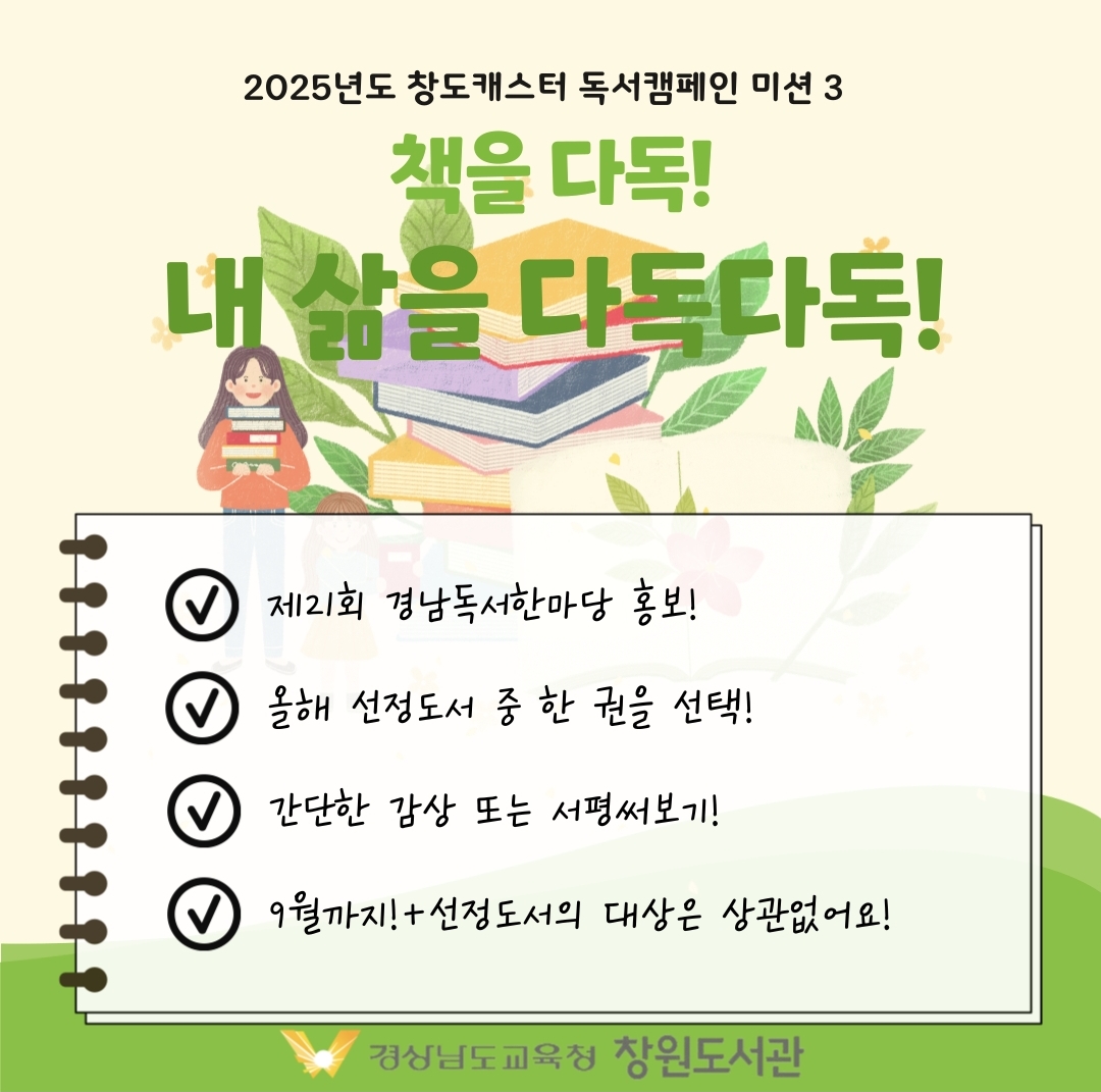 ☆ 2025년 창원도서관 창도캐스터 독서캠페인 미션 3 _ 책을 다독! 내 삶을 다독다독! ☆