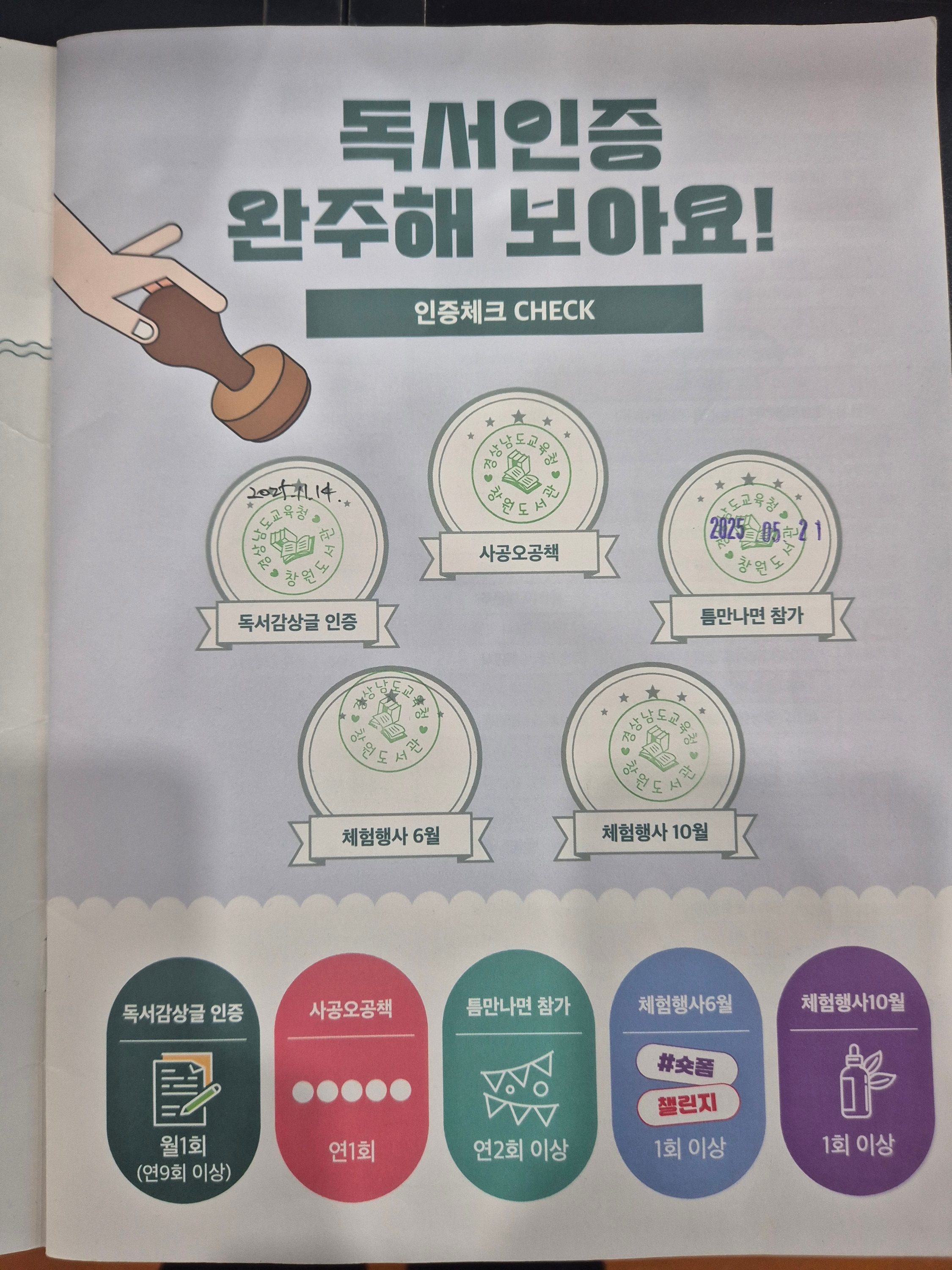 창원도서관 덕분에 생각지도 못한 다양한 행사에 참여할 수 있어 너무 좋았습니다. 마지막 인증 도장을 찍을 때는 저 스스로 뿌듯함에 기분이 좋았습니다.