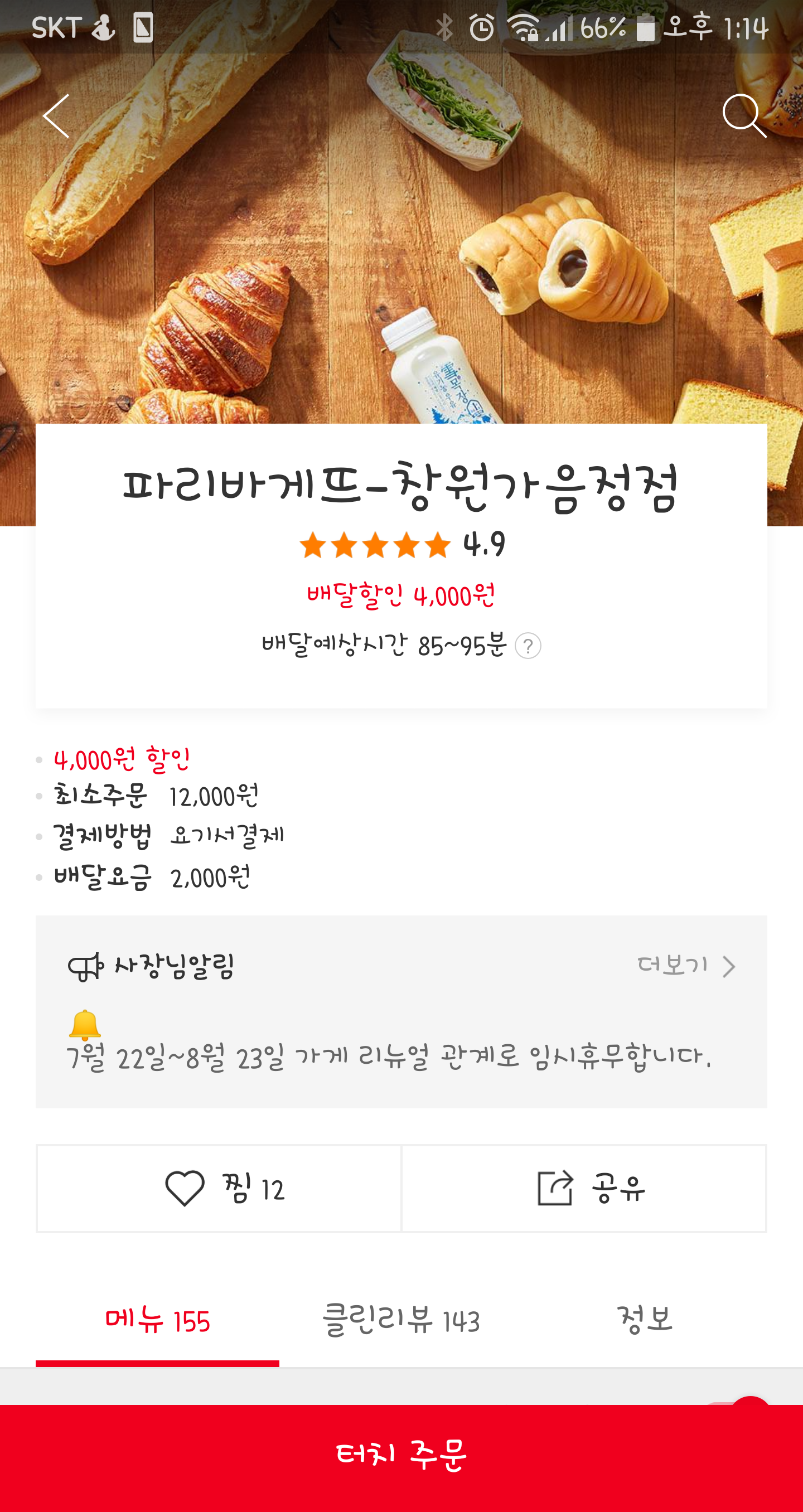 파리바게트 창원 가음정점이 배달 할인 4,000원이 되네요.